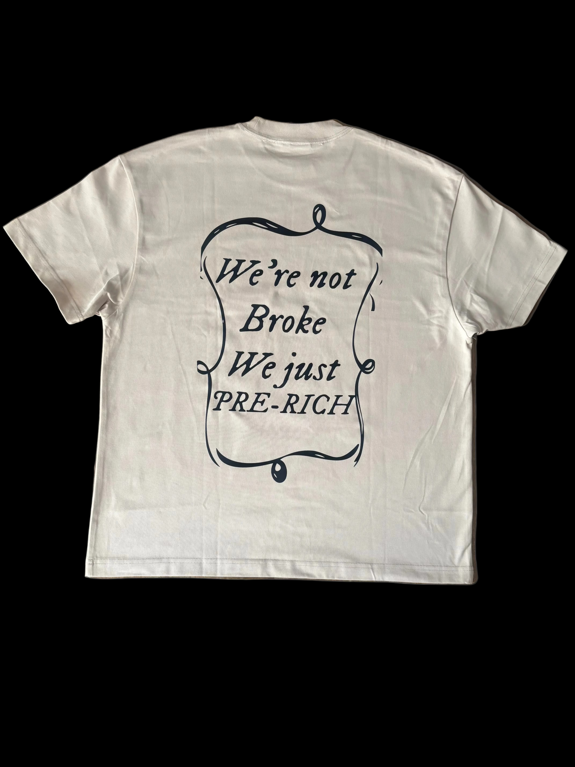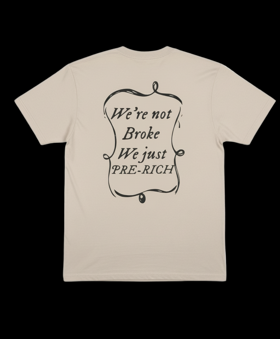 Lleva un mensaje de actitud con nuestra camiseta de algodón de primera calidad. El diseño trasero presenta un elegante marco negro con la frase 'We're not Broke, We just PRE-RICH'.